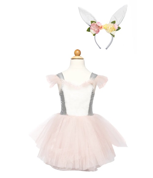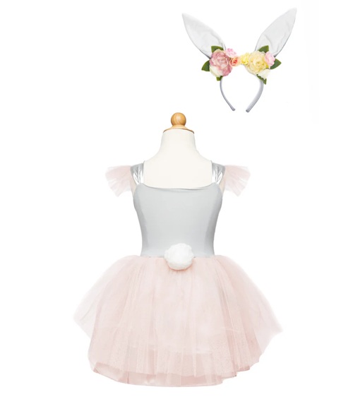 Bleikur barna kanínukjóll með hárspöng. Fölbleikur tjullkjóll með ljósgráum efri hluta, bleikum tjull ermum og kanínudindli og blómaskreytt hárspöng með kanínueyrum.