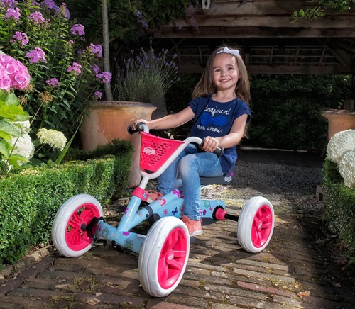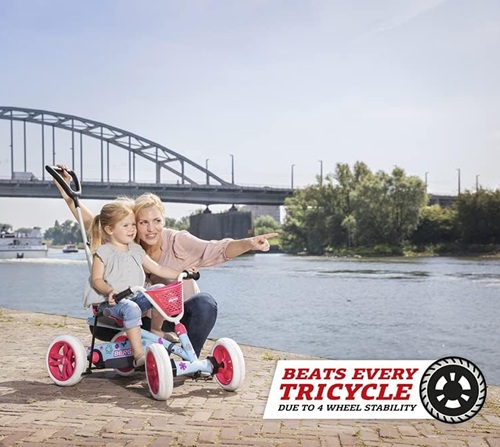 Það er auðvelt að stíga pedalana og barnið lærir að ná tökum á að nota fótstigið til að koma sér áfram og það er með fullkomna stjórn á stýri og pedölum. Hjólin eru með lágum þyngdarpunkti sem tryggir betra jafnvægi og öryggi barnsins. Dekkin eru með góðu gripi og slitþoli, góða fjöðrun og það springur aldrei á dekkjunum. Fjórhjólin æfa jafnvægi og samhæfingu barnsins. Fjórhjólið vex með barninu því það er hægt að stilla stýri og sæti. Barnið getur bæði hjóla áfram og afturábak og stoppa á örfáum sekúndum.