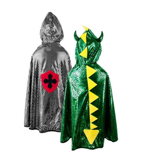 Be the dragon or the knight with this reversible cape! Featuring shiny green dragon scales, a silver shield side, red felt accents, and a hood for endless medieval fun.