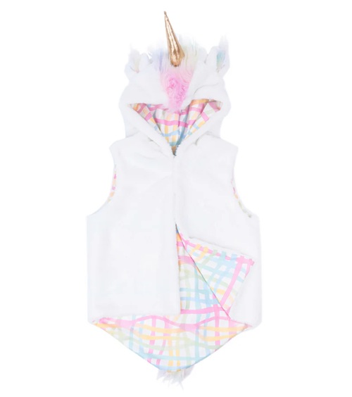 Add everyday enchantment with The All Day Everyday Unicorn Vest! Crafted from soft white fur with a gold horn, pastel accents, and gingham lining, it transforms any day into a magical adventure.