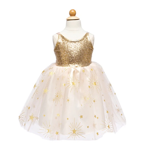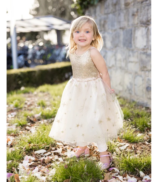 Glæsilegur og glitrandi barna gullkjóll skreyttur gylltum pallíettu toppi og glitrandi pífum með stjörnum að neðan. Töfrandi gull pallíettu tjullkjóll sem lætur barnið skína eins og stjörnu við öll tilefni.