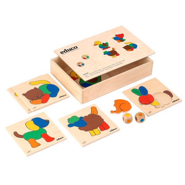 Uppbygging leiksins: Hvert barn fær púsluspil og púslstykkin er sett til hliðar. Eitt barn byrjar og kastar litateningunum. Barnið tekur púsluspilsbútann með litnum sem kom upp á teningunum og setur hann í púsluspilið. Til dæmis, ef rauður kemur upp á teningnum getur það tekið rauða púsluspilið og sett í sitt púsluspil. Sá sem fyrstur lýkur púsluspilinu sínu vinnur. Teningurinn ákveður litinn. Hver verður fyrstur til að klára dýrið sitt?