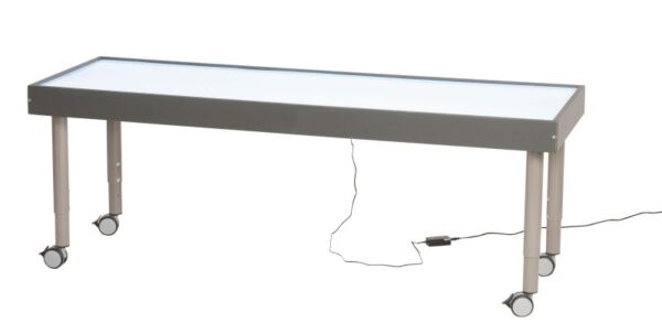 Ljósaborðið er með stórum, upplýstum fleti og möguleikum á að breyta um lit í borðinu. Grár málmrammi umhverfisborðið og hægt er að hæðastilla fætur borðsins sem eru á hjólum. Fjarstýring fylgir með möguleikum á 9 litum og 4 litabreytingum, snúru-rofi og kló, með 1,7 m tengisnúru, læsanleg hjól)