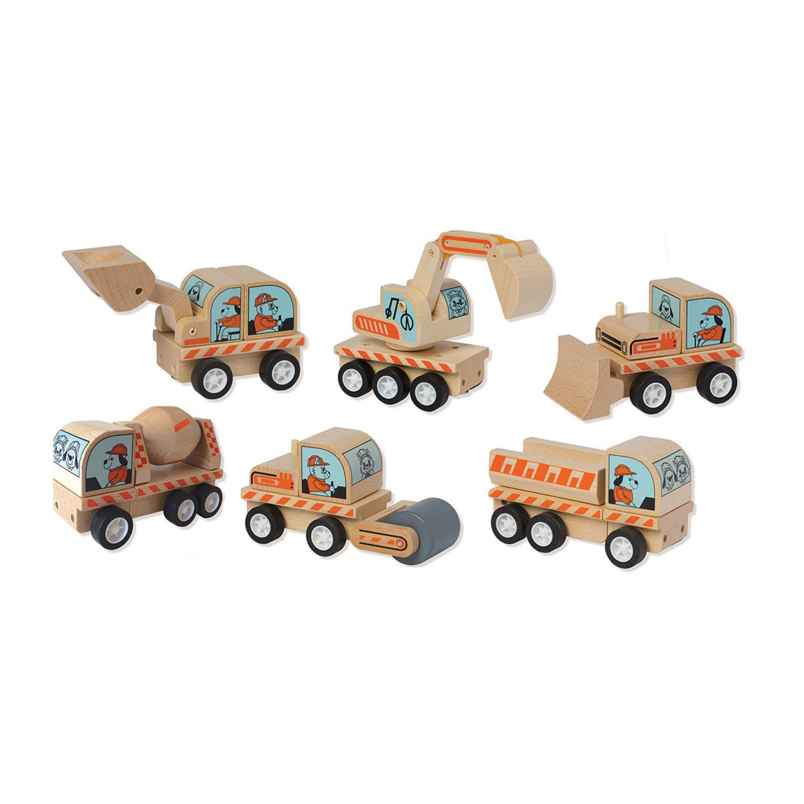 Skemmtilegir bílar úr tré. Dekkin eru úr gúmmíi svo þeir eru hljóðlátir á gólfi.