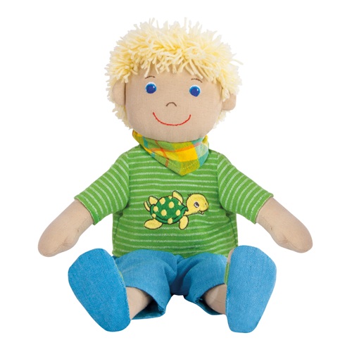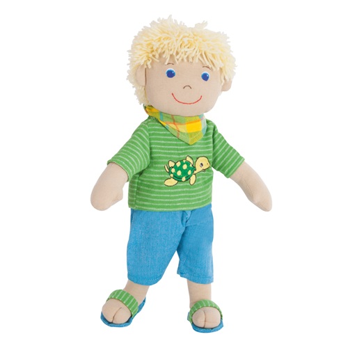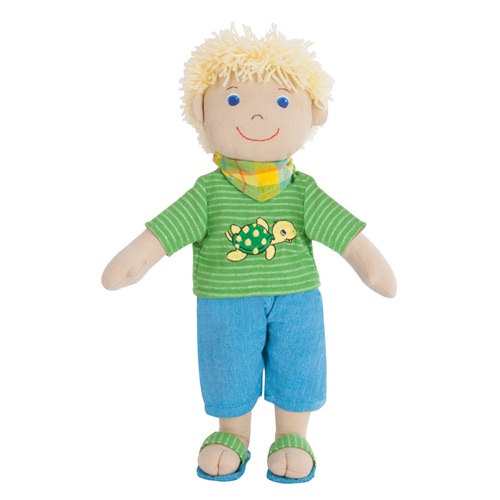 Max er brosandi mjúk dúkka úr 100% bómull frá Sri Lanka. Max er í sumarlegum grænum stuttermabol og bláum stuttbuxum og sandölum.
