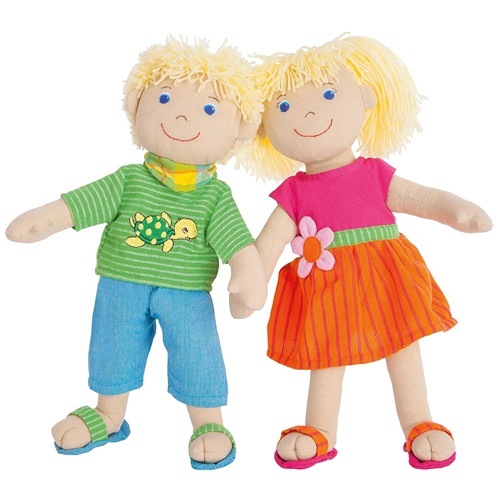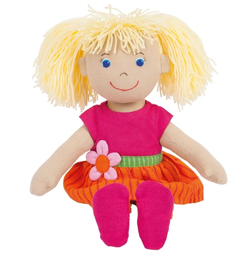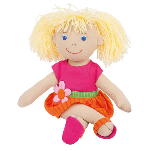 Maya er brosandi mjúk dúkka úr 100% bómull frá Sri Lanka. Maya er í sumarlegum bleikum og appelsínugulum kjól og í sandölum.