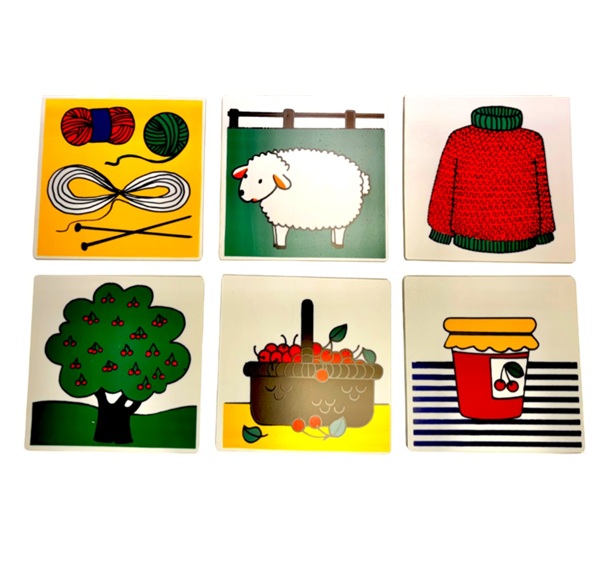 • 48 myndaspjöld sem flokkast í 3 sett