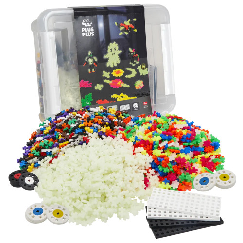 Welcome to a world of play and magic with the Build and Glow storage box containing 2000 pieces of Plus-Plus. Here you get 600 self-luminous pieces, while the remaining 1400 pieces are in neon and basic colours! The box is filled with a delightful mix of colous that glow in the dark and open the door to imaginative building experiences, along with 4 small building plates, 12 wheels and a Learn-to-Build inspiration folder.