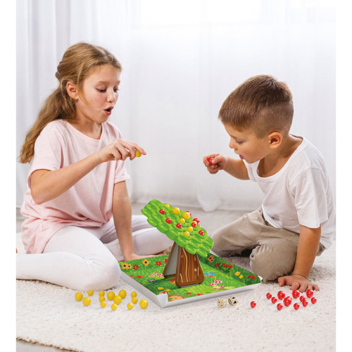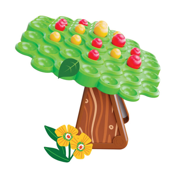 The balancing game is shaped like a wood with small depressions in the crown. The goal is to take turns placing your apples without causing the crown to tip over, so that all the apples fall down.