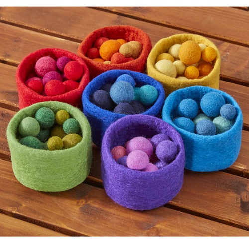 Inniheldur: 7x mislitar felt skálar | 100x kúlur úr þæfðri ull