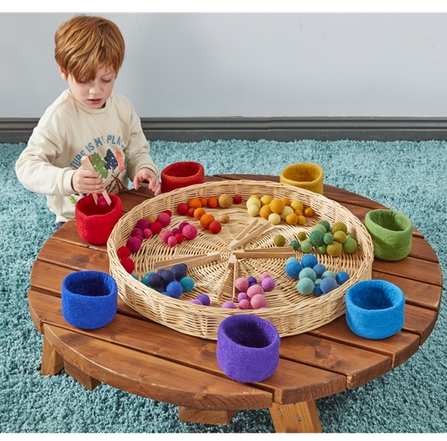 Sjö skærlitaðar skálar úr þæfðri ull og 100 litríkar kúlur, breyta flokkun, talningu og ímyndunarleik í sköpunargleði. Settið er frábært í skynjunarleik og hjálpar börnum að efla fínhreyfingar ásamt því að kynnast heimi stærðfræðinnar á skemmtilegan hátt.