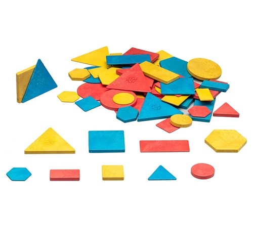 5 lögunarform: hringur, þríhyrningur, sexhyrningur, ferningur og rétthyrningur; 3 litir: rauður, gulur og blár