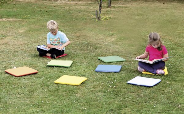 Ferkantaðar gólfsessur bólstraðar og mjúkar 35x35cm sem henta vel í kennslustofu, í leikherbergi eða á bókasafni. Sætispúðarnir koma í fjórum litum gulum, rauðum, grænum og bláum og er hægt er að nota bæði inni og úti.