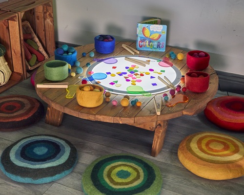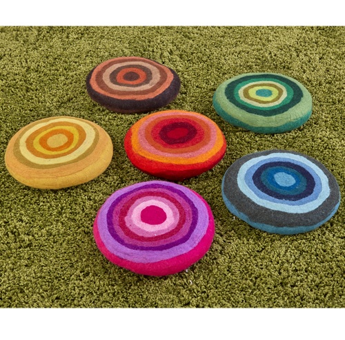 Í settinu eru 6 hringlaga, litríkir sætispúðar. Gólfsessur eru mjúkar, gerðar úr ull og hefur filtið róandi áhrif og hjálpar börnum að slaka á og einbeita sér. Sessurnar henta vel í kennslustofu, í leikherbergi, á bókasafni og í heimahúsi.