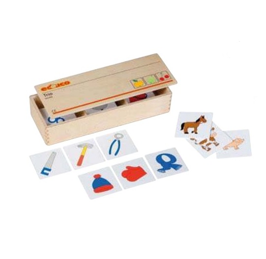 Hvetjið orðaforða barna með 16 þemaflokkum í leiknum Trio. Börn raða saman þremur myndakortunum sem mynda samstæðu á meðan þau nefna hverja mynd. Börn geta lært að nota mismunandi orð fyrir sömu myndina. Skemmtilegt spil sem bætir orðaforða barna.