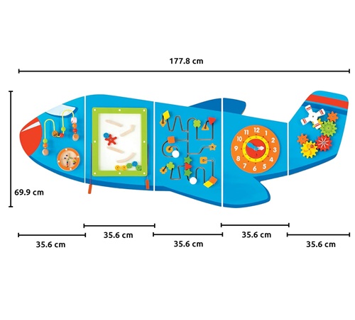 Skynjunar- og þrautaborð sem er veggfest. Skynjunarborðið inniheldur 6 mismunandi verkefni. Þrautabrautin æfir fínhreyfingar og samhæfingu handa og augna barnsins þegar þau fylgja hlutunum eftir krókóttum leiðum, kennir þeim rökrétta hugsun, vekur forvitni og hvetur þau til að leysa og skoða verkefnin á leikborðinu. Auðvelt að hengja upp á vegg.